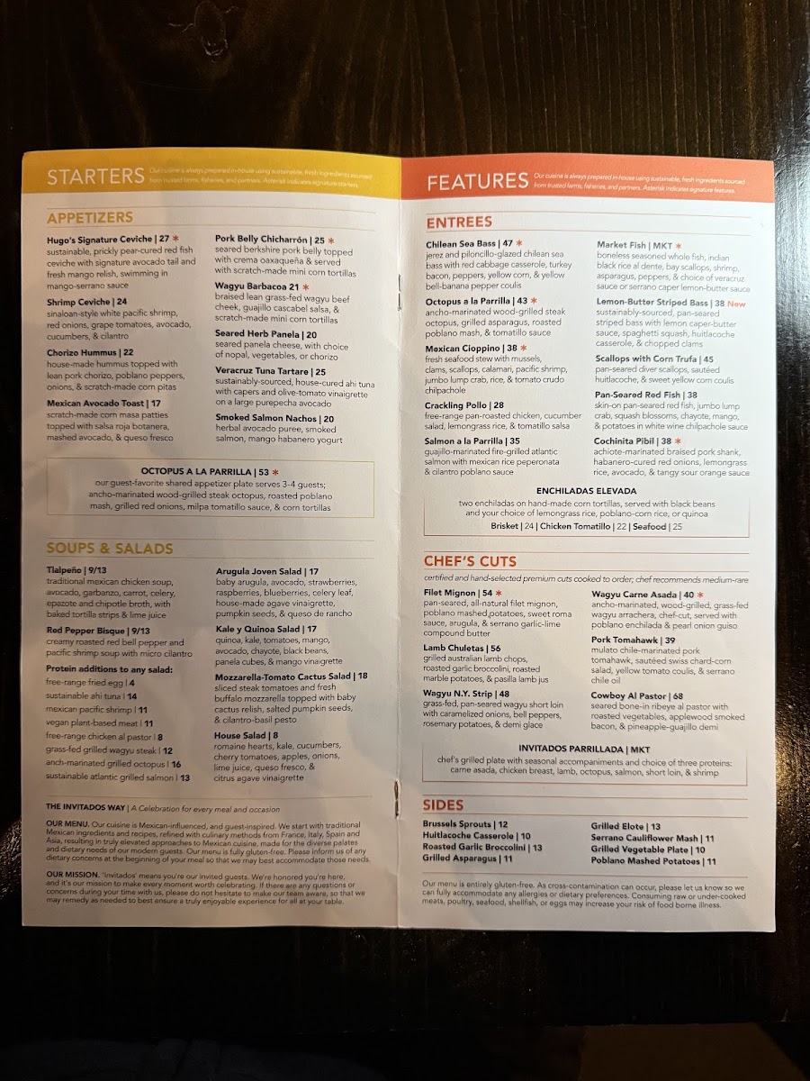 The menu at Hugo's features an impressive array of options, designed to tantalize your taste buds. Start your meal with their Pork Belly Chicharrón, where seared Berkshire pork belly meets a zesty tomatillo de milpa sauce, elegantly embraced by housemade corn tortillas. Or perhaps the Veracruz Tuna Tartare, showcasing house-cured ahi tuna and a delightful olivetomato vinaigrette, will beckon you to dive into its fresh, vibrant flavors. Each appetizer is artfully crafted, setting the stage for a truly memorable meal.